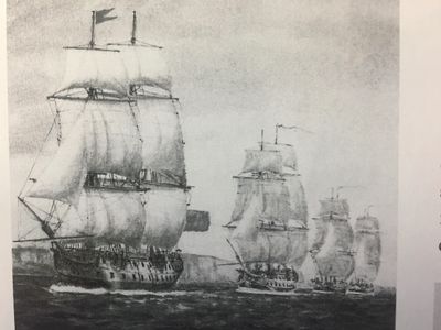"In the summer of 1776...the American Revolution came precariously close to a calamitous end. In late July, a British fleet--the largest expedition ever sent to American waters--sailed into New York harbor. The four hundred ships carried thirty-two thousand soldiers...General William Howe, a wily and seasoned veteran...commanded the British Army...The British mission was direct: qwell the American Rebellion by overwhelming force. [Howe] had every reason to think [he] would make quick work of it." (Image from Mariner's Museum, Newport News, VA, printed in McCullough D, "1776." Simon and Schuster, NY, 2005)